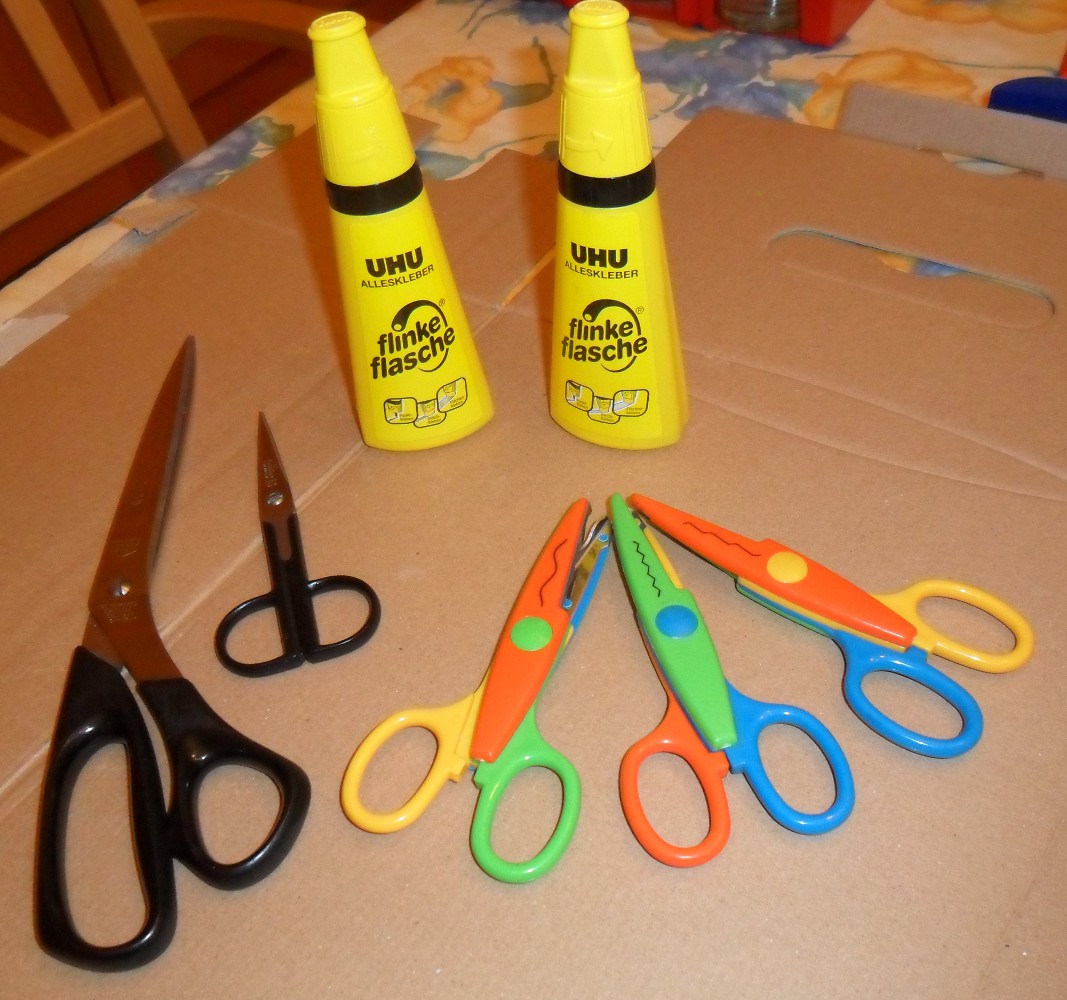 Außerdem solltet ihr euch ausreichend Klebe und Scheren in verschiedenen Größen und mit verschiedenen Schnitt-Mustern zurechtlegen.