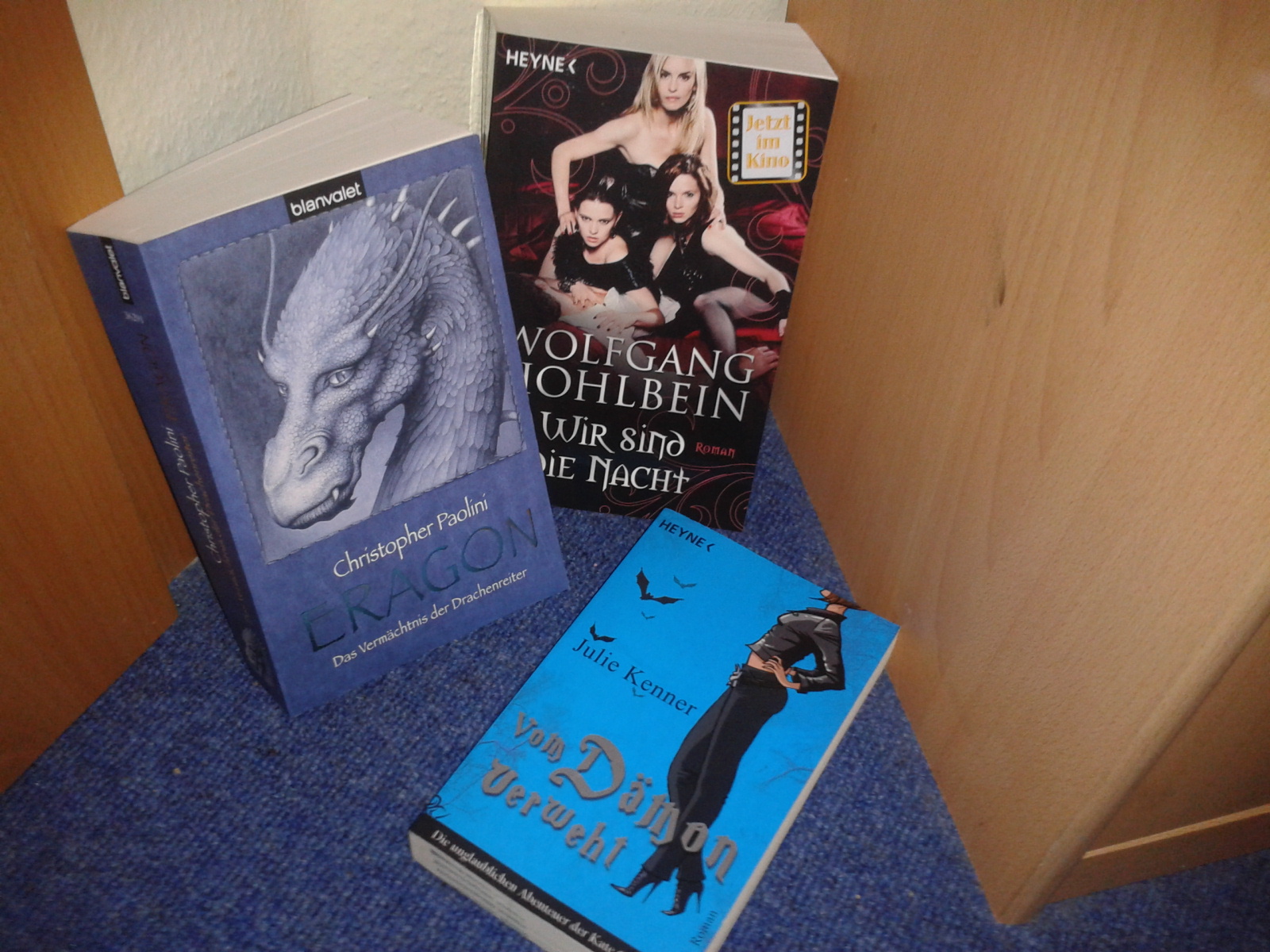 Zum einen „Vom Dämon verweht“ von Julie Kenner, „Wir sind die Nacht“ von Wolfgang Hohlbein und „Eragon 01: Das Vermächtnis der Drachenreiter“ von Christopher Paolini. Eragon hatte ich nie vor zu lesen, aber wenn es so billig ist… ach ja Ausreden über Ausreden! xD